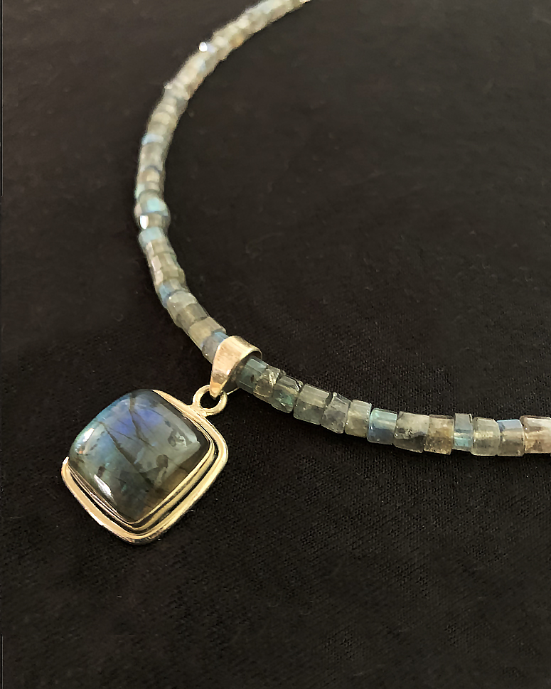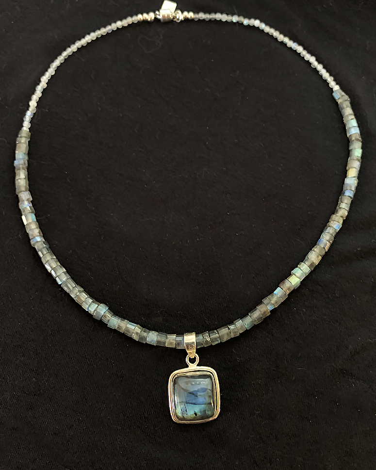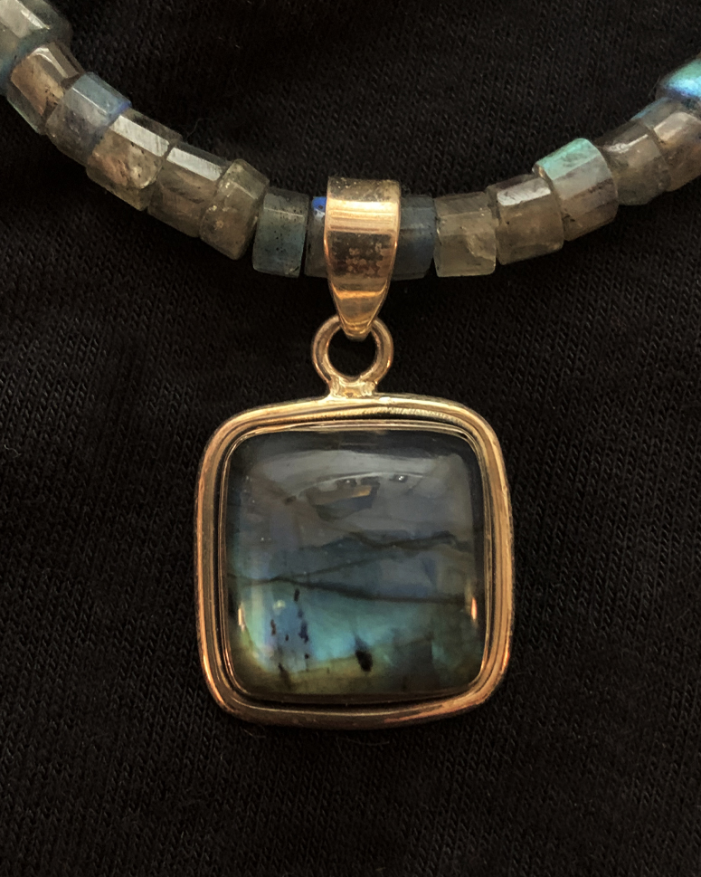 This pendant is strung on 18" of Labradorite tubular beads, finished with tiny 2 mm beads, and a sterling magnet clasp.