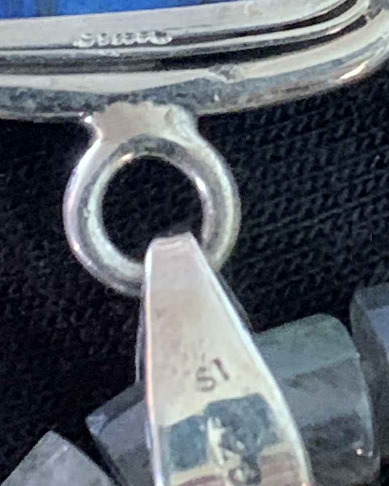 Signed by Navajo silversmith, Dean Sandoval, Jr., this sterling silver vintage pendant is set with a square labradorescent cabochon -- This stone is particularly labradorescent, with captivating color streams.