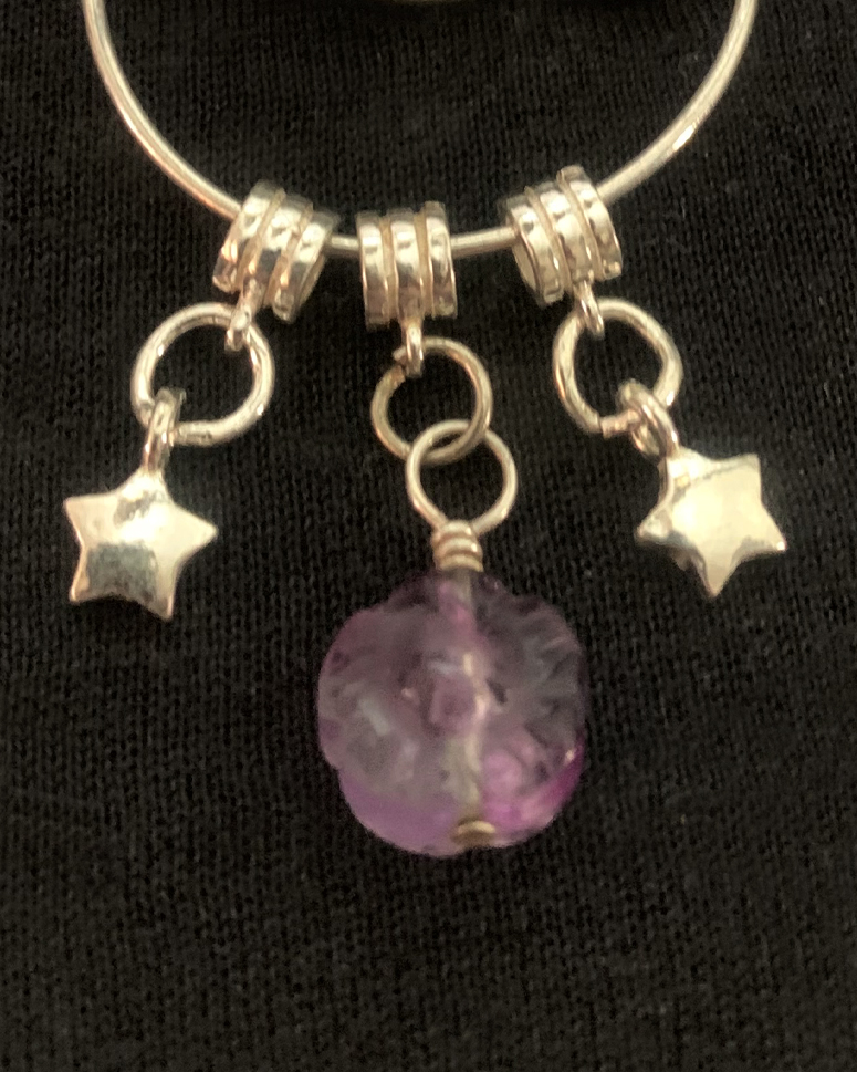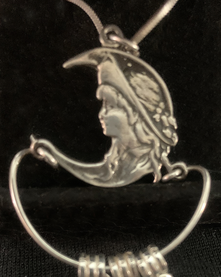 Everyone knows it's not a Man in the Moon! It's the Lady Moon! Beautiful sterling silver Art Nouveau Lady in the Moon reproduction charm holder. Add your own charms to the sterling stars and rainbow flourite chrysanthemum flower moon charms, to make it your personal powerful charm necklace.