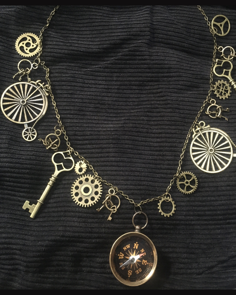 Antiqued bronze compass, with steampunk penny farthing bicycles, gears and keys on 30" bronze chain.