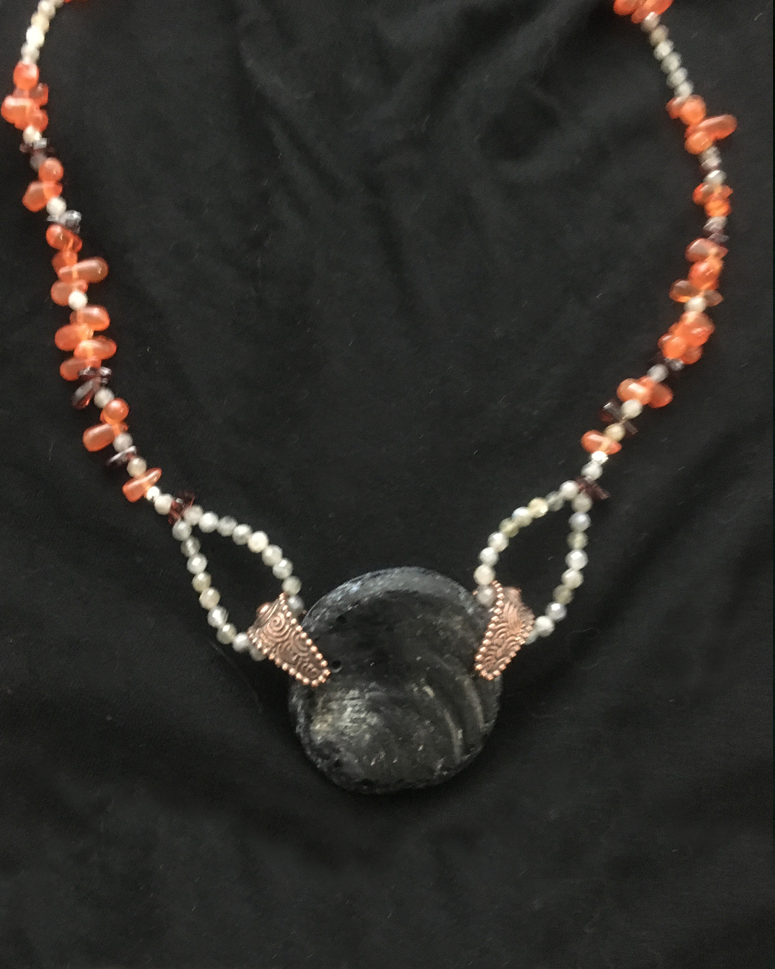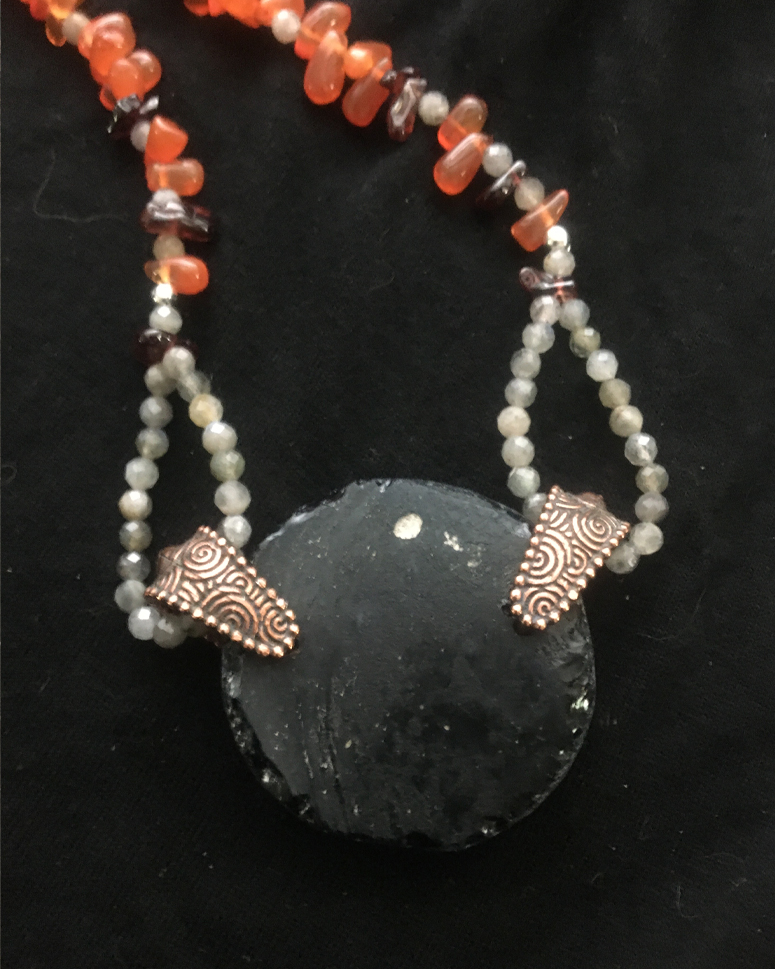 An ancient artifacts to wear! This pendant is strung with carnelian, labradorite, and other gemstone beads.