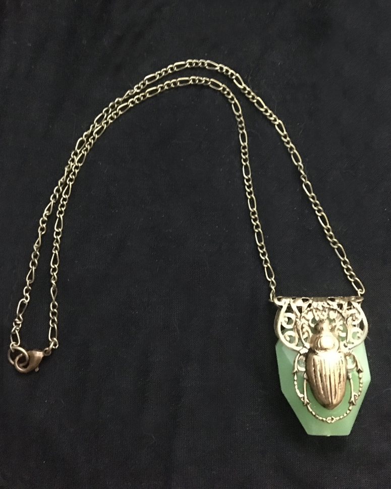 A beautiful Brass Scarab Filigree Scarab Pendant that is a wonderful example of vintage 1910's Czech Peking Glass. Fashioned in antique brass, with an intricate filigree, this scarab is from the early century Egyptian Revival trend in jewelry.