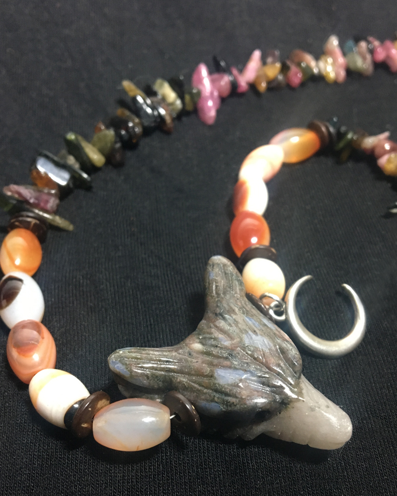 strung with antique Tibetan dzi agate beads, and multi-color tourmaline chips to create a true power piece for your collection, or for serious energy.